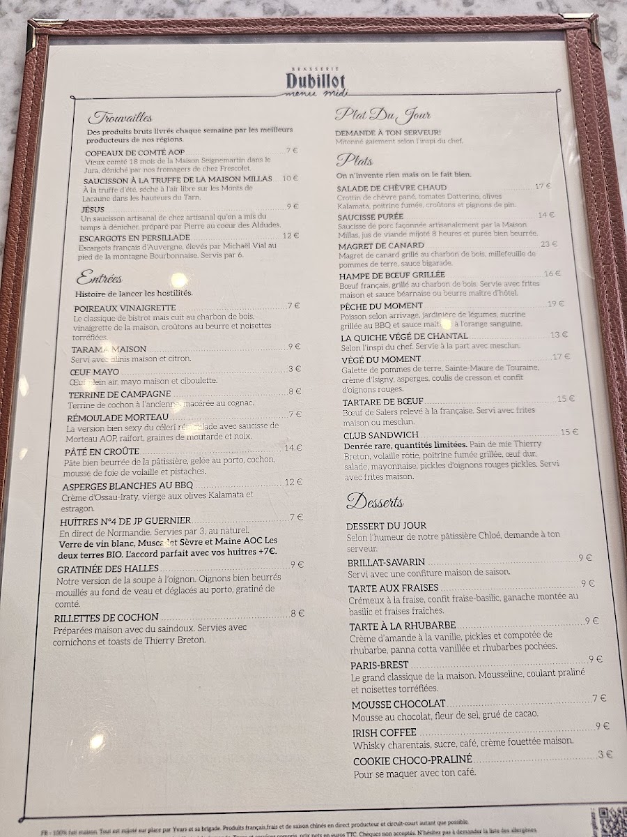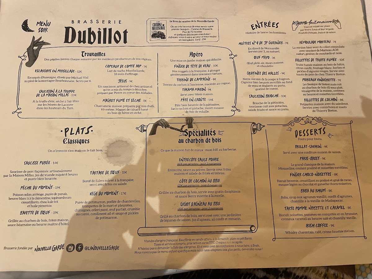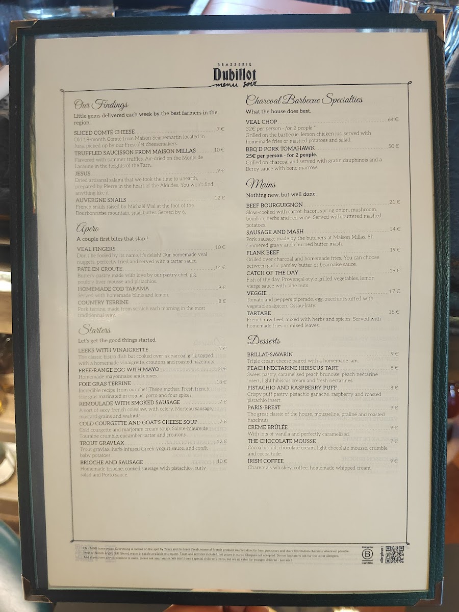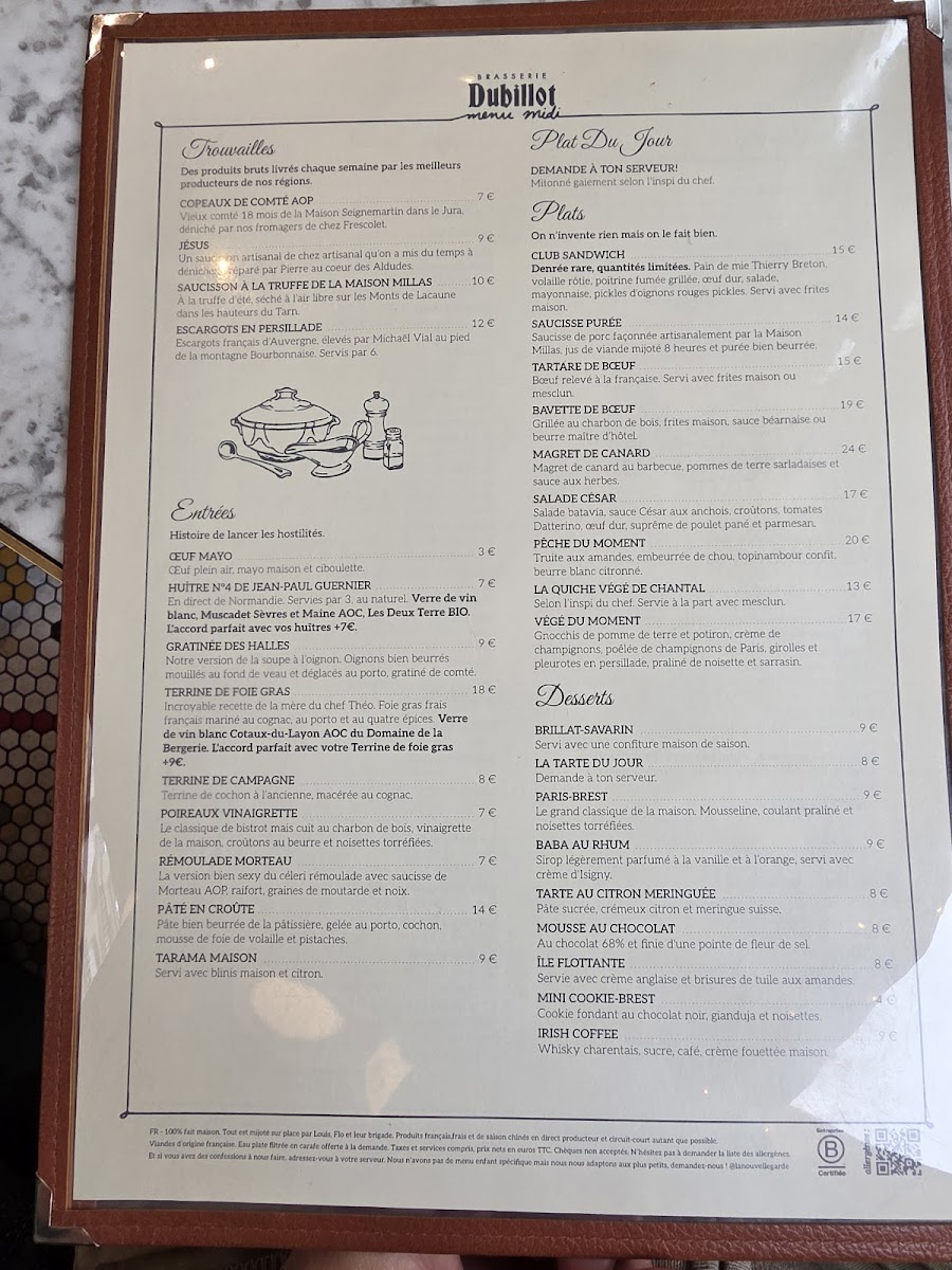 Overall, the menu at Brasserie Dubillot invites you to experience everyday moments with a sense of ease and authenticity, reflecting the essence of Parisian dining—simple, well-made dishes served in a warm and welcoming setting.