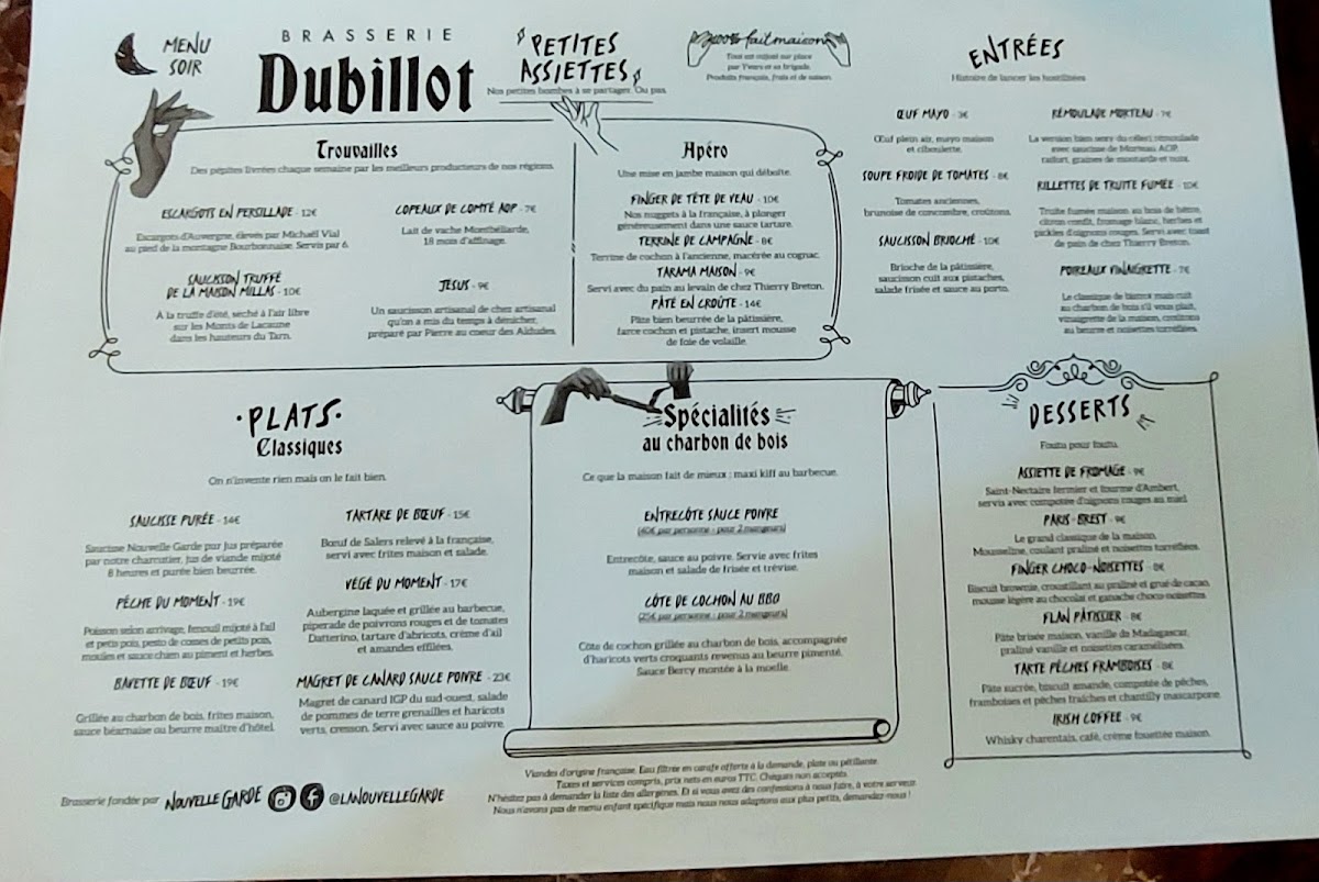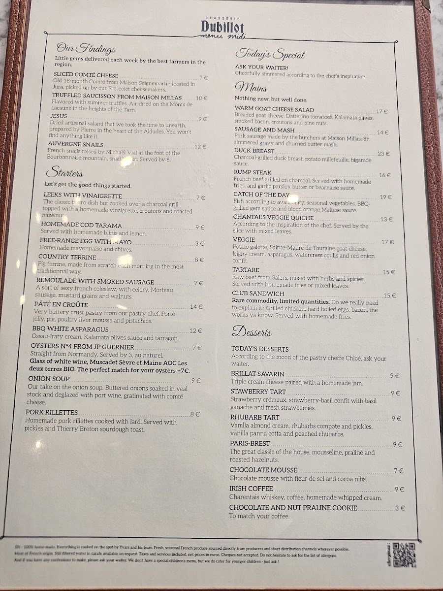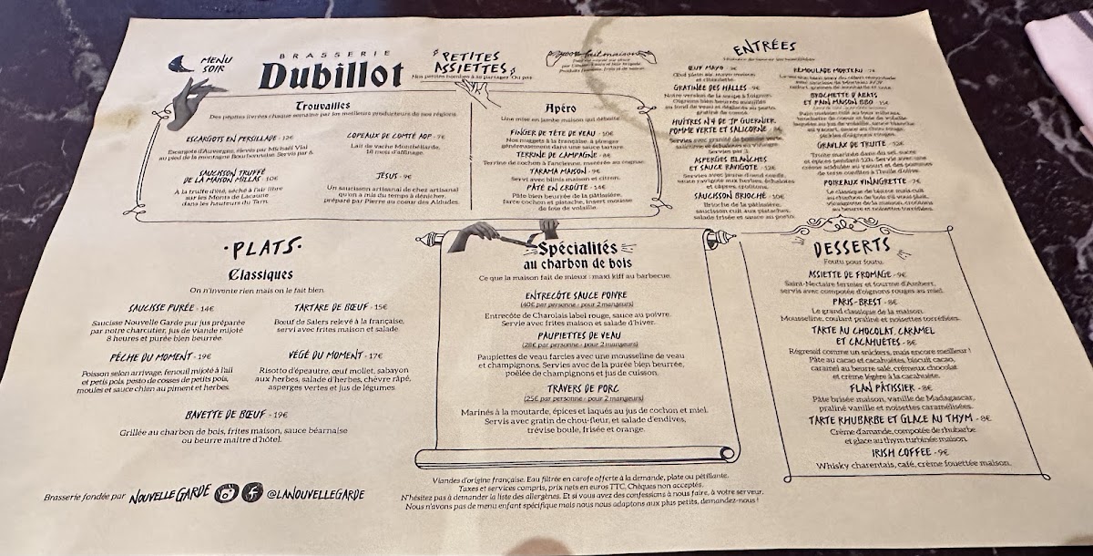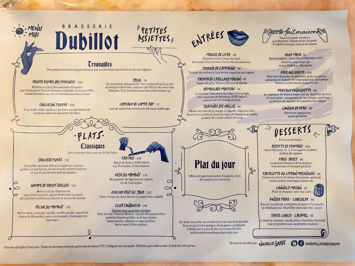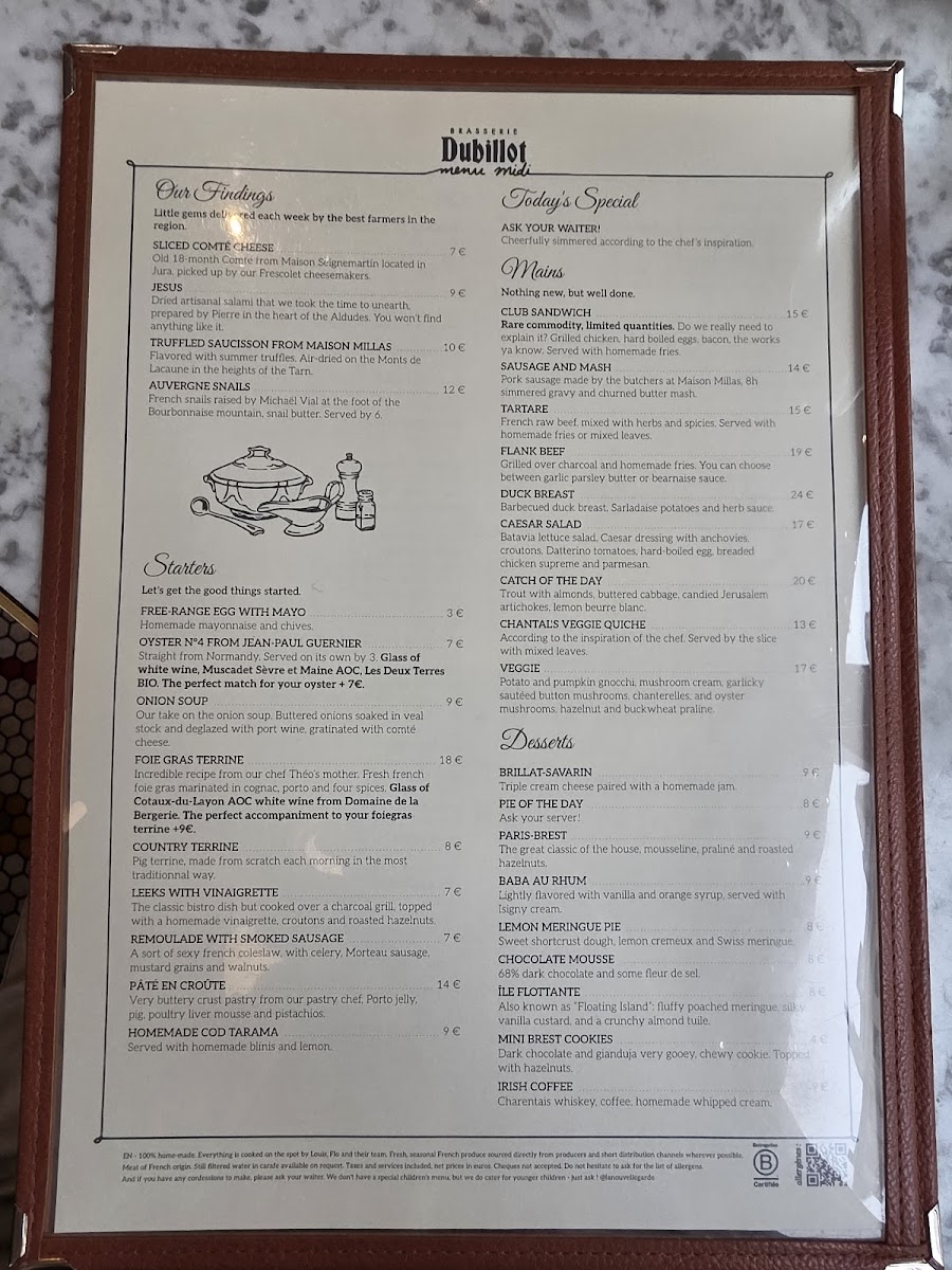 Overall, the menu at Brasserie Dubillot invites you to experience everyday moments with a sense of ease and authenticity, reflecting the essence of Parisian dining—simple, well-made dishes served in a warm and welcoming setting.